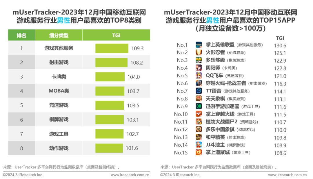 游戏服务行业的男性用户群体则对对抗性较强的游戏类别表现出更强的偏好性。TOP15APP中,MOBA游戏服务-掌上英雄联盟、动作游戏-火影忍者分列前两位。