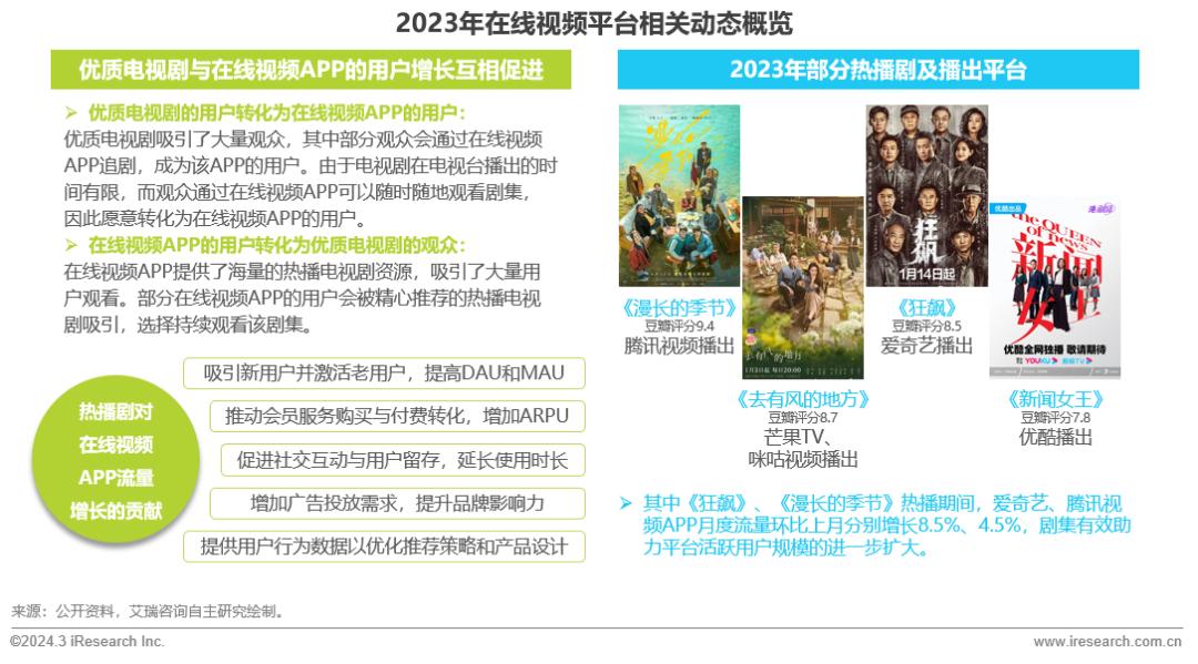2023年,优质剧集对在线视频平台的流量和口碑产生了显著影响,热播剧如《繁花》、《狂飙》和《漫长的季节》等吸引了大量观众,显著提升了在线视频平台的DAU和MAU,并促进了付费转化和ARPU的增长。同时,这些优质剧集的播出也有效提高了平台的口碑,吸引了新用户、激活了老用户,并推动了社交互动和用户留存,广告主也更倾向于在这些高流量、高口碑的剧集上投放广告。在线视频平台借此进一步提升了其竞争力和收益。