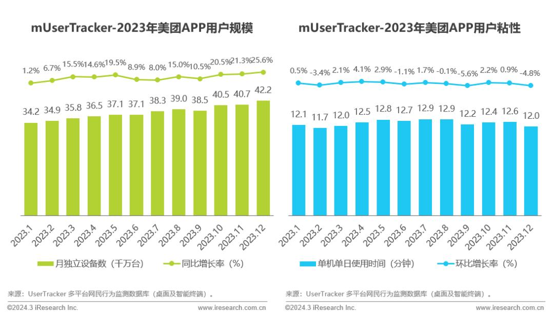 抖音进一步提升本地生活服务的战略优先级,与美团持续展开激烈竞争,共同促进了市场的深度激活和繁荣。其中美团APP流量12月相较1月增长23.5%;
