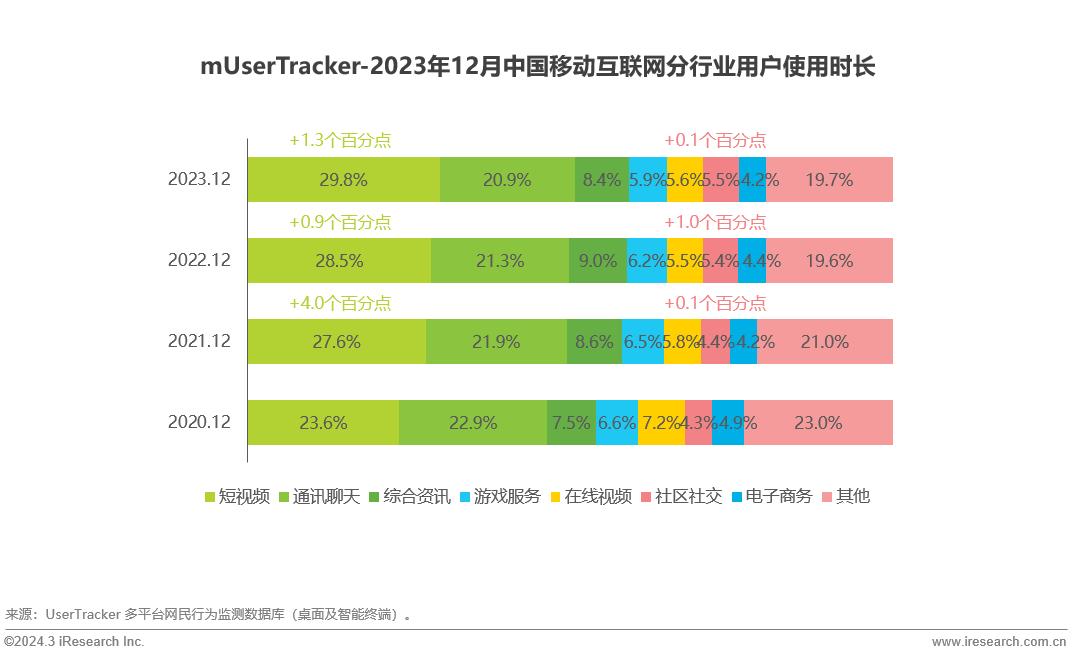 短视频行业持续挤占其他行业时长,对网民注意力的吸引效果进一步强化;社区社交行业时长占比小幅提升