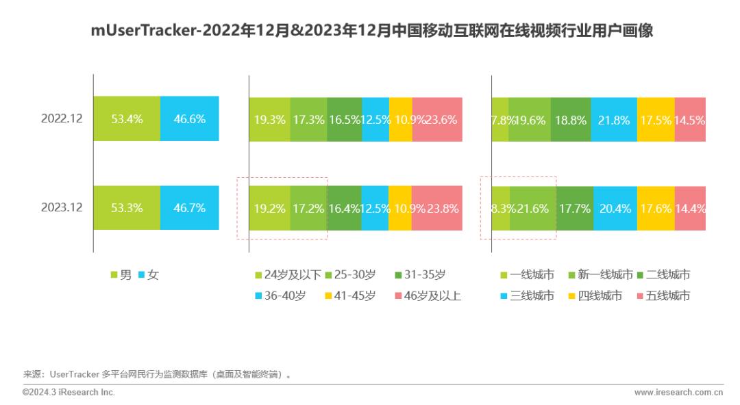 对比2022、2023年12月在线视频行业用户画像,用户属性占比整体变化较小,30岁及以下年轻群体仍为重要流量来源,46岁及以上用户占比提升千分之二,高线级城市用户中一线占比提升0.5%、新一线提升2.0%。