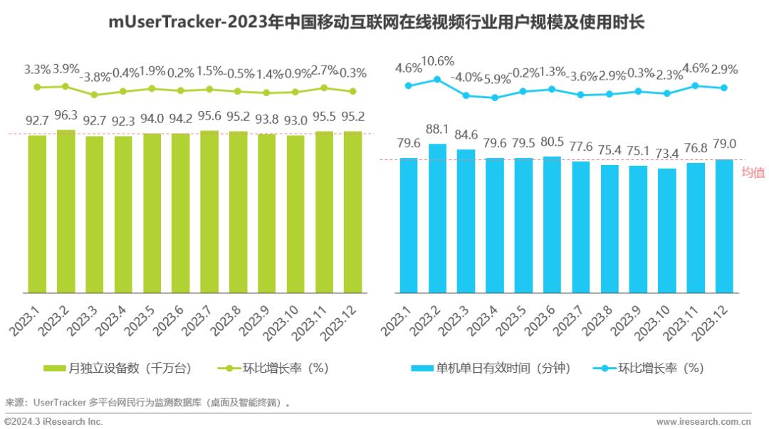 2023年1-12月,在线视频行业月独立设备数均值达9.42亿台,同比2022年略减少1.8%,环比增长率均值为0.5%,行业流量整体趋稳,12月行业移动端渗透率达68.4%。从使用时间来看,2023年用户单日使用时长均值为79.1分钟,月环比增长率均值为0.4%,其中2月现象级热剧《狂飙》播出期间,行业用户使用时长达全年峰值。