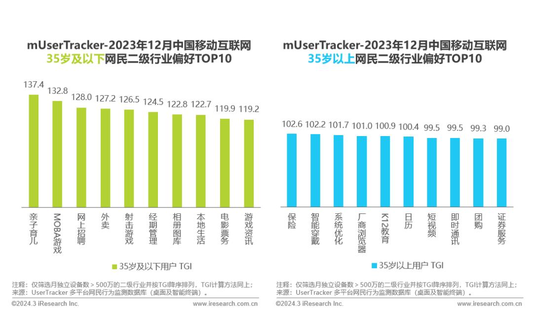 中青年用户对亲子类、游戏类及招聘相关APP偏好较为明显,成熟用户群体则更偏爱金融理财类、智能穿戴类及实用工具类APP