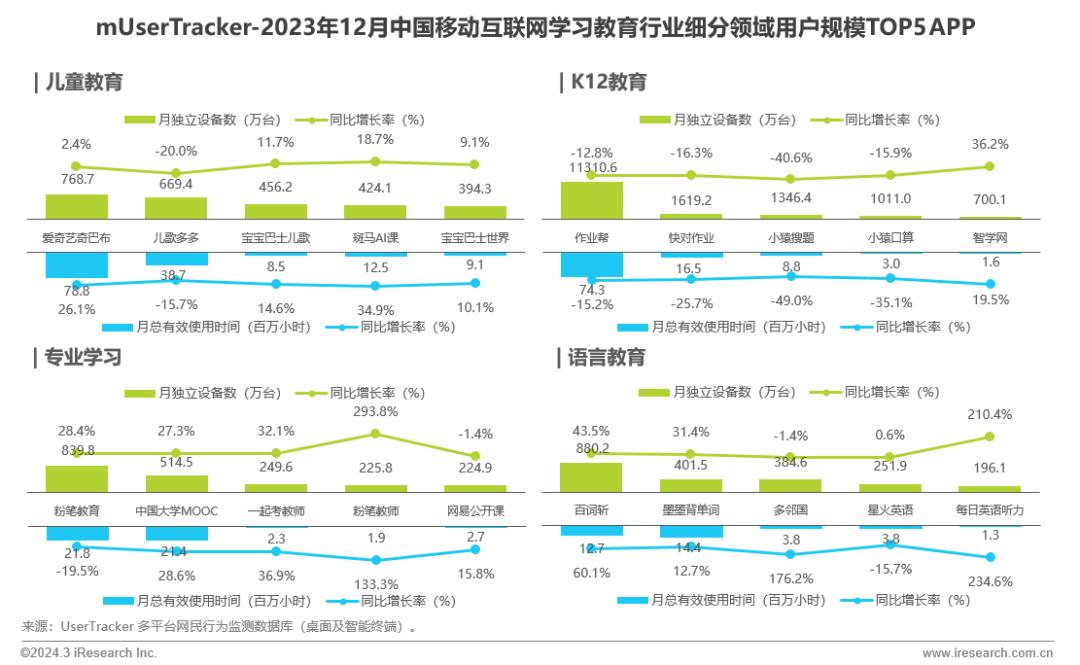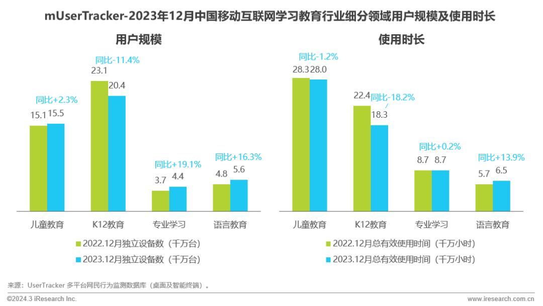 学习教育行业中,细分领域的流量及用户使用时长呈现出差异化趋势,儿童教育12月相较于2022年同期流量变动相对平稳;而受“双减”政策深度影响,K12教育行业经历了显著下滑,不仅用户规模同比缩减了11.4%,用户平均使用时长也减少了18.2%;与此相反,专业学习和语言教育两个细分行业则展现出强劲的增长势头,显示出这两个领域仍蕴含着巨大的发展潜力和市场空间。