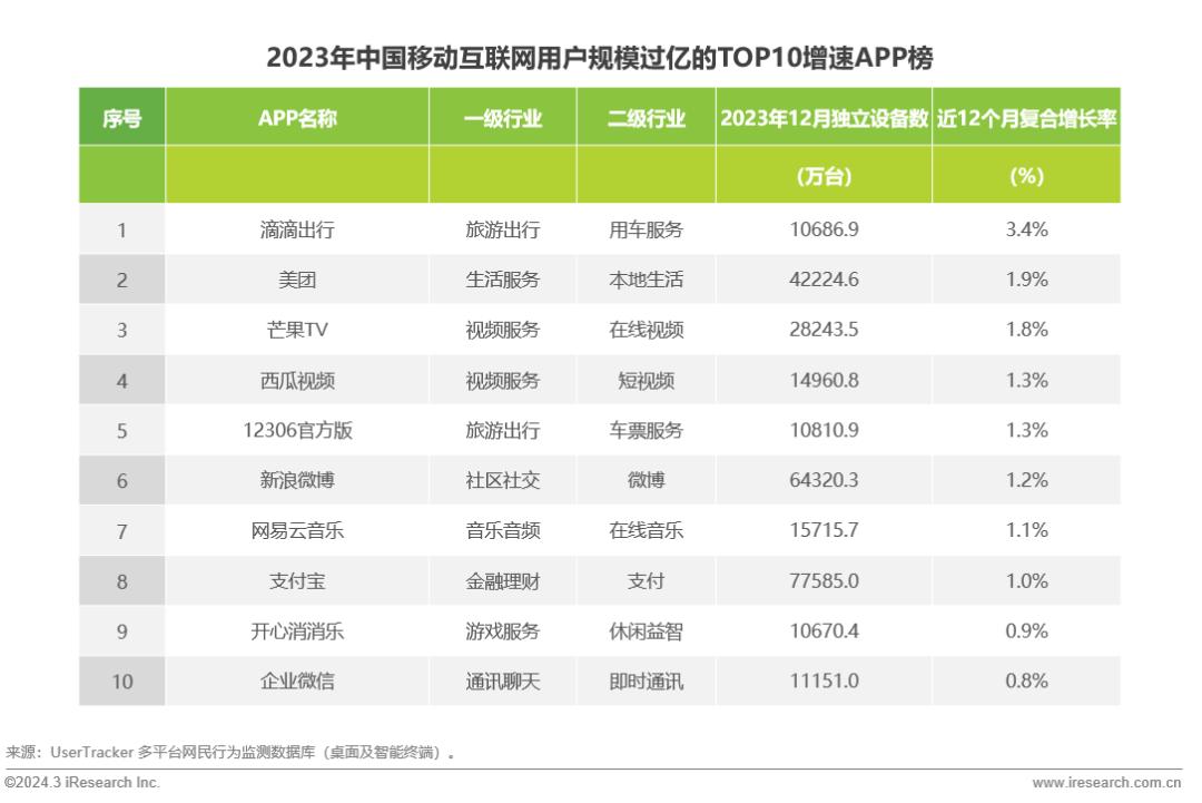 2023年中国移动互联网用户增速榜用户规模过亿的TOP10增速榜