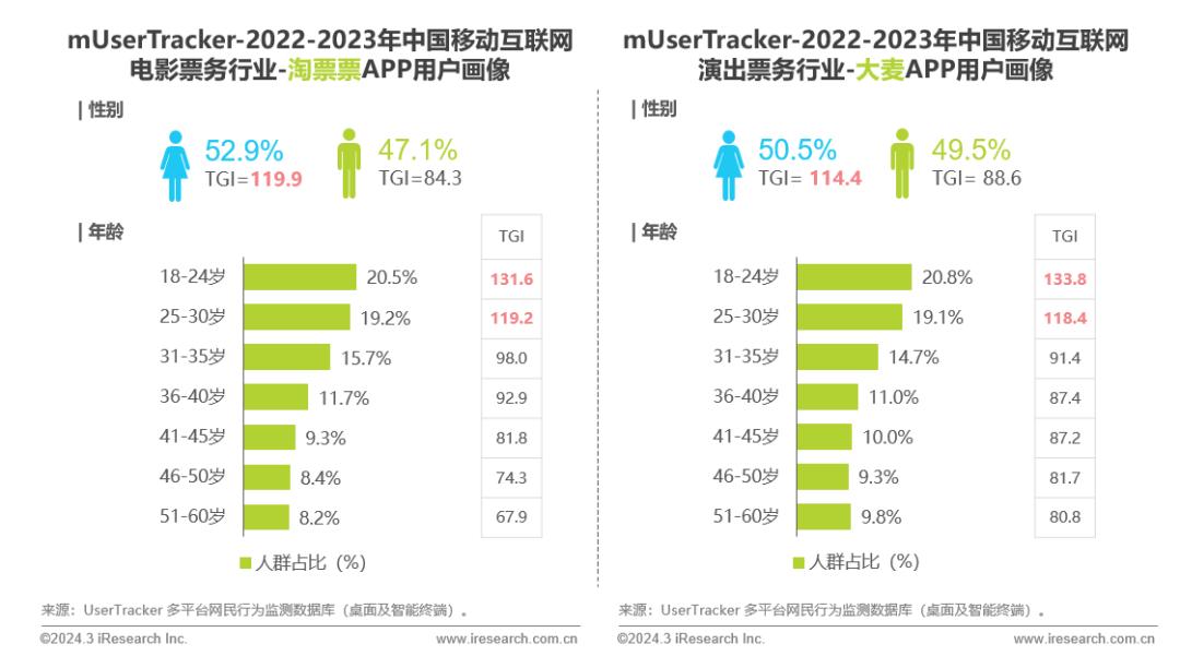 对比两大典型APP用户画像来看,二者用户群体呈现较高共性:女性用户占比高于男性,且TGI大于100;30岁及以下用户群体占比均接近四成,且年龄越小、占比越高、使用偏好越明显。年轻女性群体在电影及演出票务市场中扮演着举足轻重的角色,构成了消费的重要部分。