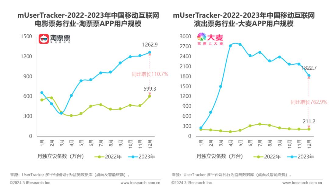 2023年,电影演出票务市场持续火爆,以淘票票和大麦为代表的两大票务APP活跃用户规模显著增长。至12月,两者流量同比增幅均突破三位数,显示出消费者对相关娱乐消费的极高热情与强劲需求释放。