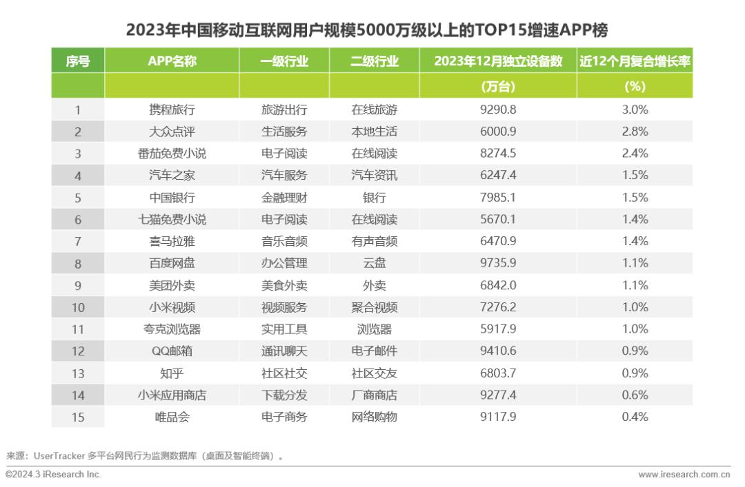 从用户增速来看, 2023年12月MAU(月活跃设备数)亿级以上的APP复合增长前三名为:滴滴出行、美团、芒果TV;MAU达5000万级以上的APP复合增长前三名是:携程旅行、大众点评、番茄免费小说。