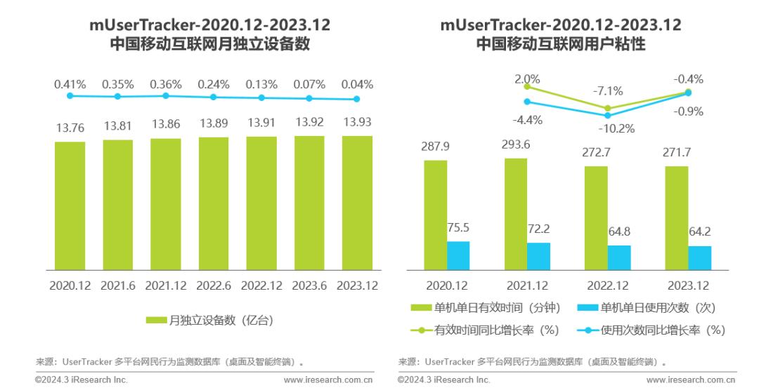 用户规模趋于饱和,增速放缓: 截至2023年12月,中国移动互联网月独立设备数达13.93亿台,与年中相比仅增长了微小的万分之四;网民人均单日使用时长为271.7分钟、人均单日使用次数为64.2次,线上粘性同比负增长。这意味着市场已经进入了更为成熟和饱和的阶段,增量空间有限,竞争焦点已经转向深度挖掘存量用户的价值。尽管整体市场趋于饱和,但仍有部分细分领域展现出较大的增长空间。