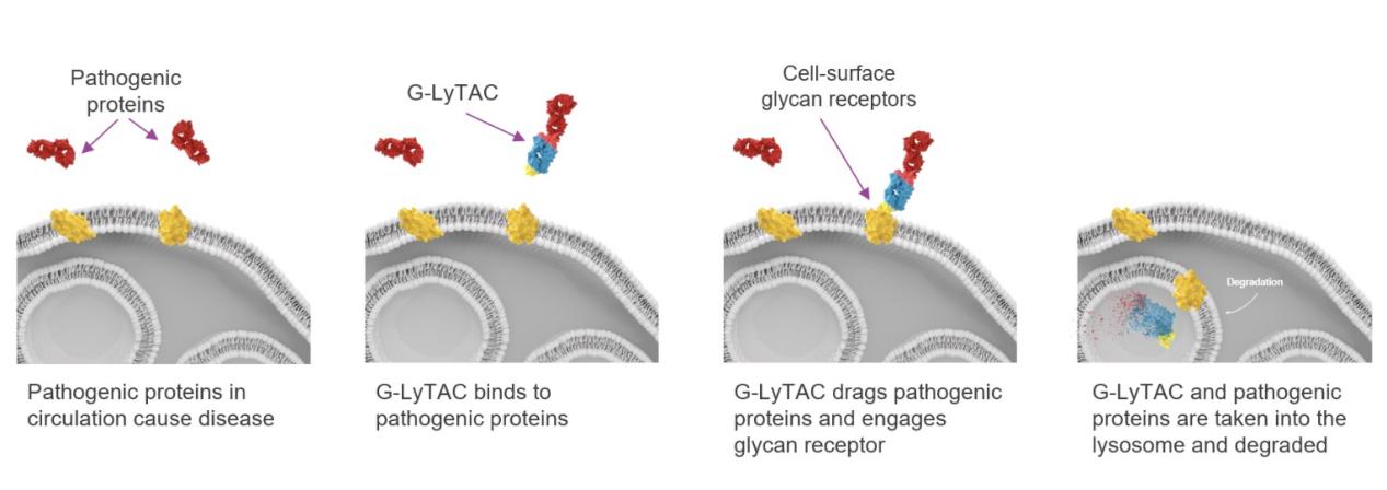 GlycoEra的双功能生物制剂能够与人体内致病蛋白质结合,利用受体内吞将致病蛋白质运输至溶酶体内进行降解并排出人体外,快速且彻底地去除人体内的致病蛋白。与PROTAC和分子胶等细胞内蛋白质降解剂不同,GlycoEra的双功能生物制剂能够捕捉细胞外和细胞膜上的致病蛋白靶标,且GlycoEra利用天然存在的生物合成途径来设计双功能生物制剂,这让模块化、经济高效且可扩展的蛋白质降解剂设计和制造成为可能。