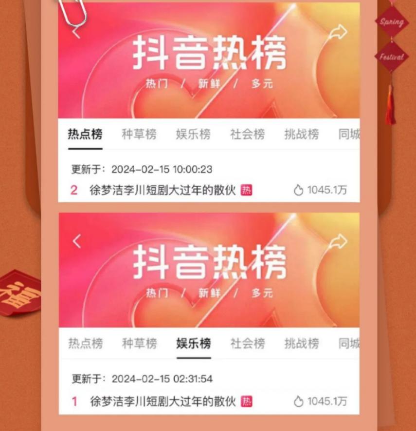 快手如此,抖音自然也有明星坐镇。短剧《大过年的》由徐梦洁、李川两位演员主演,在春节期间上映,获得一致好评,开播首日冲上抖音热榜第二位、微博热搜第三位,开播次日首集点赞量破百万,开播次日单集播放量破亿,位居抖音短剧榜最热榜第一名。