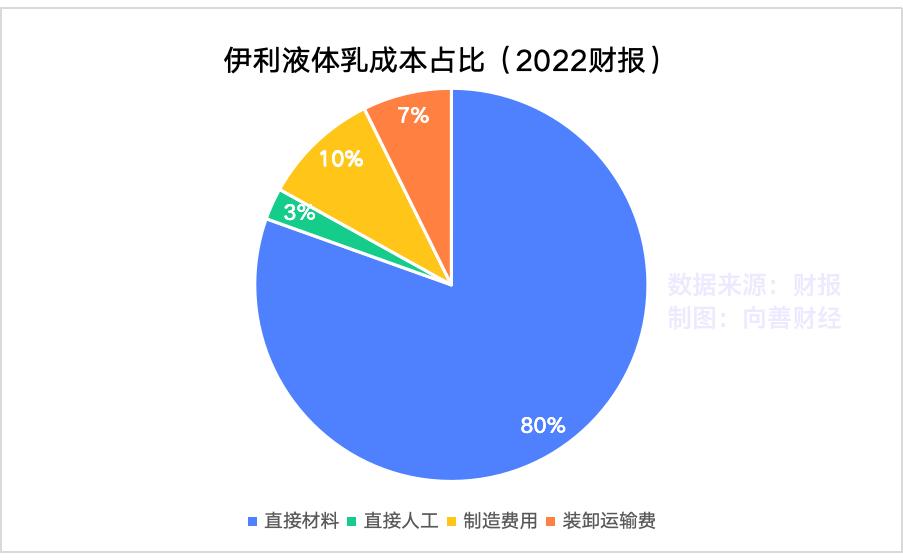 成本结构上,根据22年财报,伊利液体乳产品中,直接成本占比81.7%。所谓直接成本?其实大部分就是原乳采购成本。