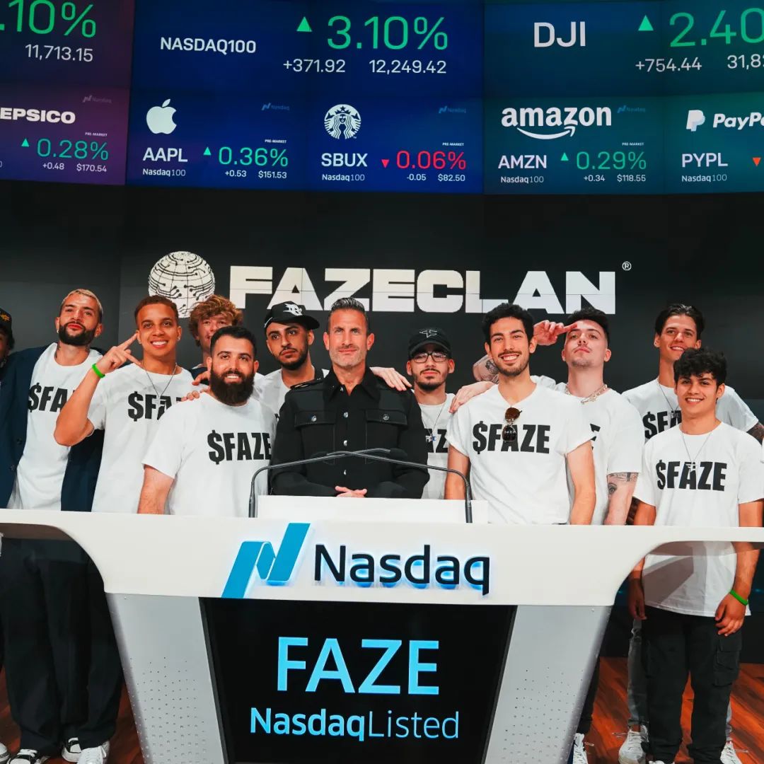 这一切都始于2022年7月20日。那天,一位穿着黑色衬衫的中年人和10个上身印有「$Faze」图案T恤的年轻人,见证了Faze Clan在纳斯达克敲钟。就此,电竞行业史上首个估值达到10亿美元的俱乐部诞生。但后来的故事证明,这是Faze走向下坡路的开始。