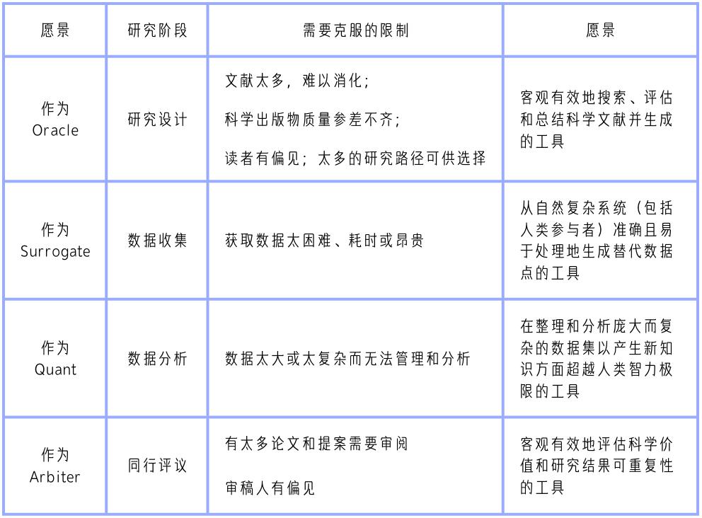 表|科学研究中的 AI 愿景。通过分析最近有关 AI 改善跨科学学科知识生产潜力的出版物,得出以上四种类型。纳入的论文要么使用“AI”这个通用短语,要么提到 AI 概念之下的特定方法,最常见的是机器学习、自然语言处理和大型语言模型。该表总结了愿景如何响应不同的研究阶段,以及对科学能力和效率的感知限制。