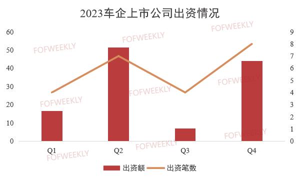 据FOFWEEKLY不完全统计,2023年车企上市公司共计出资达23笔,出资规模超118亿,平均单笔出资规模约5.16亿。