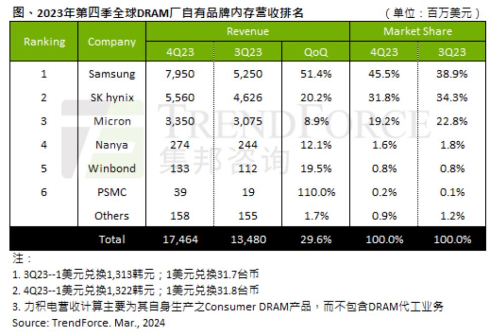 据TrendForce统计,2023年第四季度,全球DRAM产业总营收达174.6亿美元,季增29.6%。排名前六的厂商在2023年第四季度营收环比增长都为正数,且增幅普遍较大,特别是力积电(PSMC),增幅最高,达到110%。