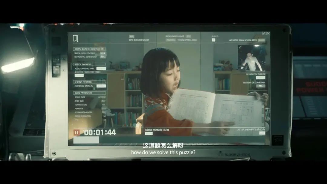 乃妍母亲戴着 VR 头显和触感手套,伸手拿起物品在虚拟世界和「乃妍」互动,当她下意识地想抱起「乃妍」时,她失败了。