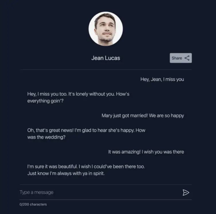 通过 Seance AI 等初创公司的服务,用户填写逝者的姓名、年龄、逝世原因、性格特征、亲缘关系等,输入逝者留下过的文本,然后就能用文字与 AI 聊天。