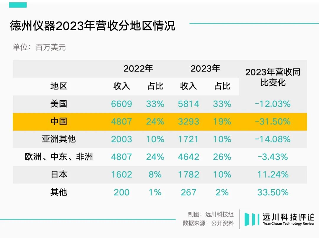 2023年,德州仪器销售额下降13%,创造十年以来最大降幅,其中中国区收入锐减32%,拖了最大的后腿。