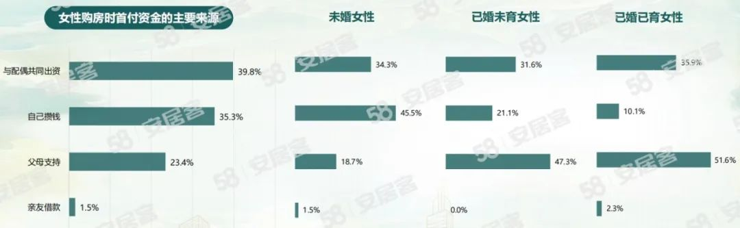 在购房的首付方面,四成女性选择与配偶共同出资买房,有35.3%的女性首付的主要来源是靠自己攒钱。未婚女性中靠自己攒钱买房的占比最高,为45.5%。与2022年相比,自已攒钱出首付买房的女性占比有所提高。