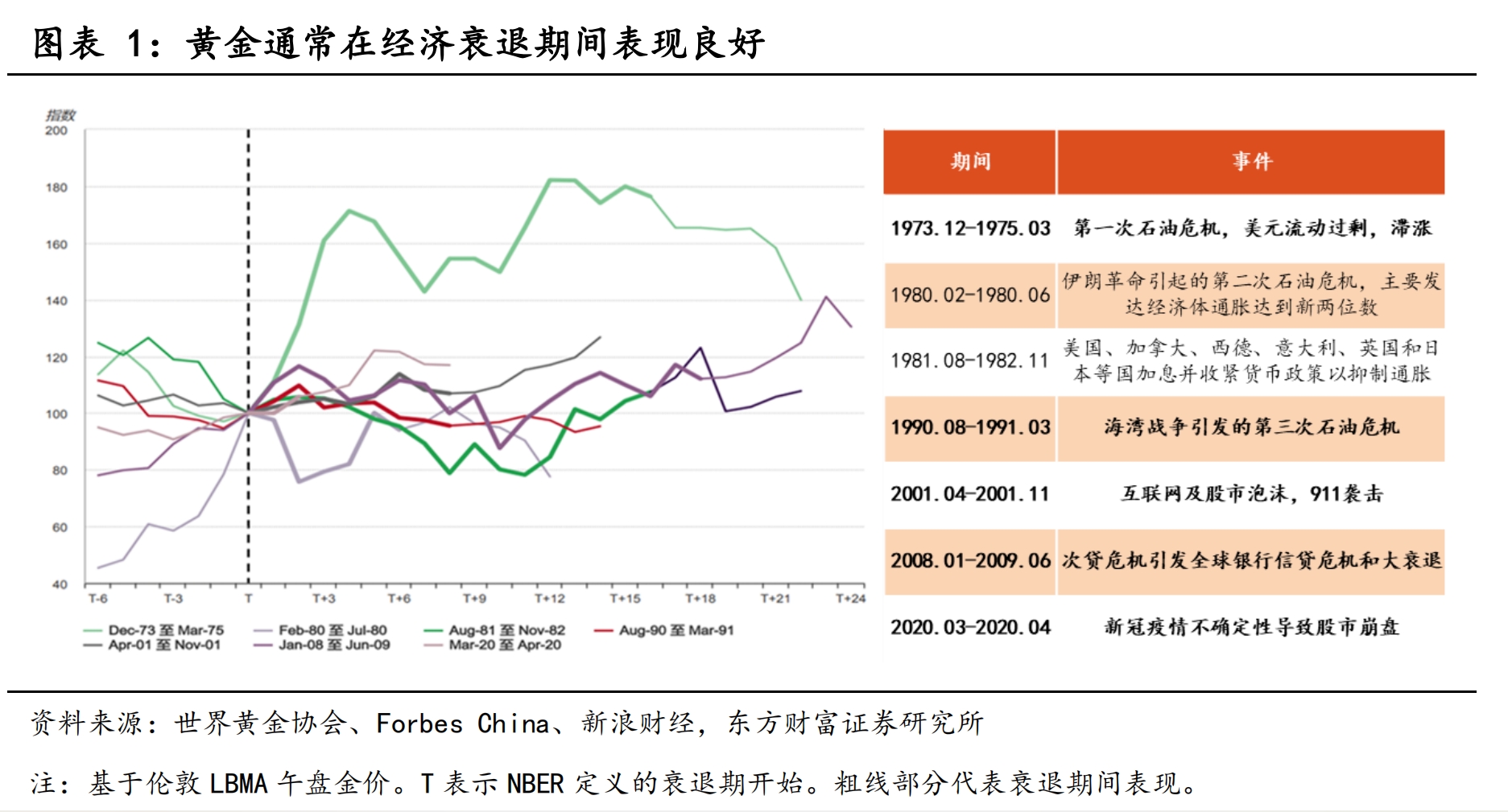 东方财富证券研究所发布《黄金珠宝行业专题:进击的逆周期品类,大众与奢侈品的过渡》研报,报告指出,黄金在经济衰退期间表现良好,过去一年国内外金价再创新高。