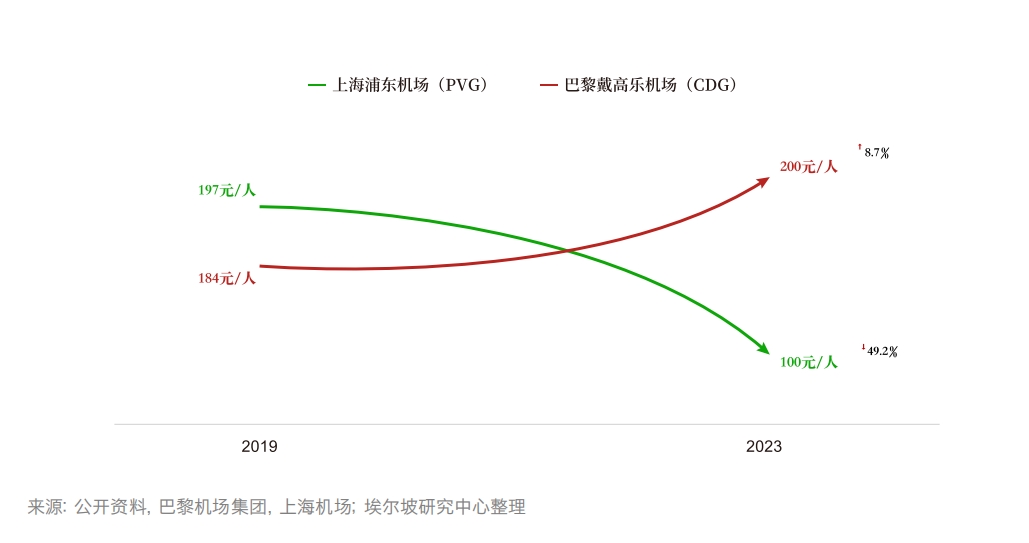 2019年,浦东机场和上海戴高乐旅客吞吐量几乎一致,都是7600多万人次,而浦东机场客均消费金额超过巴黎戴高乐的机场,达到了197元/人次, 同期的戴高乐机场折合成人民币只有184元/人次。但到了2023年,浦东机场的客均消费降到了100元左右,而戴高乐机场则继续上涨至200元。