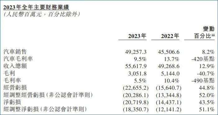 蔚来去年共交付新车160038辆,同比增长30.7%,但这一数据的增速已经是连续3年放缓了。结合同年183.507亿元的经调整净亏损,蔚来平均每卖出一辆车就要亏11.47万元。与此同时,蔚来新车的销售成本也水涨船高,达到525.661亿元,同比增长19.1%;汽车毛利率9.5%,连续第二年下滑,还不到2021年的一半(20.1%)。