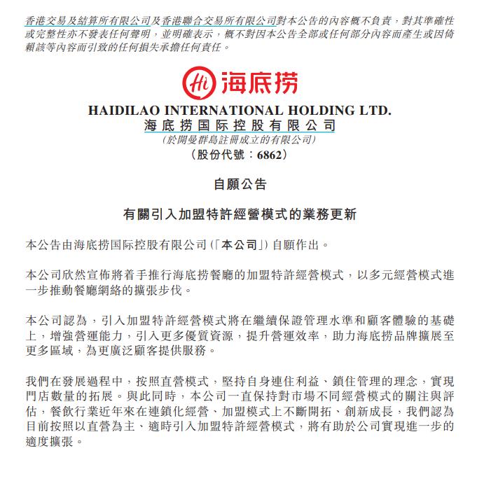 而今,海底捞开放加盟,并在公告中表示:“本公司认为,引入加盟特许经营模式将在继续保证管理水准和顾客体验的基础上,增强营运能力,引入更多优质资源,提升营运效率,助力海底捞品牌扩展至更多城市,为更广泛顾客提供服务。”