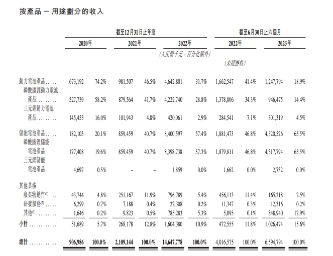 根据公司招股书数据,从2020年至2022年,瑞浦兰钧动力电池产品营收占比分别为74.2%、46.5%、31.7%;而储能电池产品营收占比分别为20.1%、40.7%、57.4%。2023年上半年,储能电池营收占比已达65.5%。