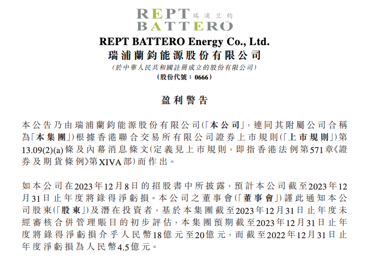 2月29日晚间,瑞浦兰钧发布盈利警告称,预计公司在2023年净亏损18亿-20亿元,2022年同期净亏损为4.5亿元。