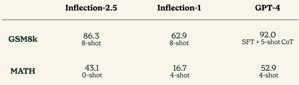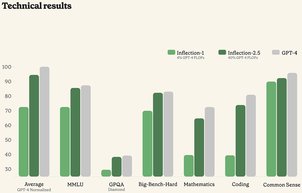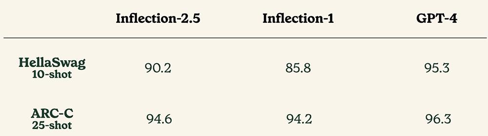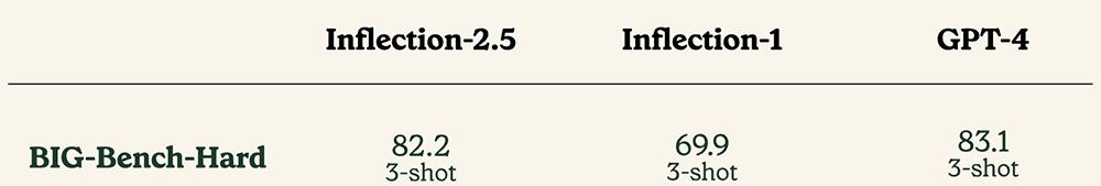 在BIG-Bench-Hard(大语言模型难以解决的BIG-Bench问题的子集)上,Inflection-2.5性能比Inflection-1提高10%以上,接近GPT-4。