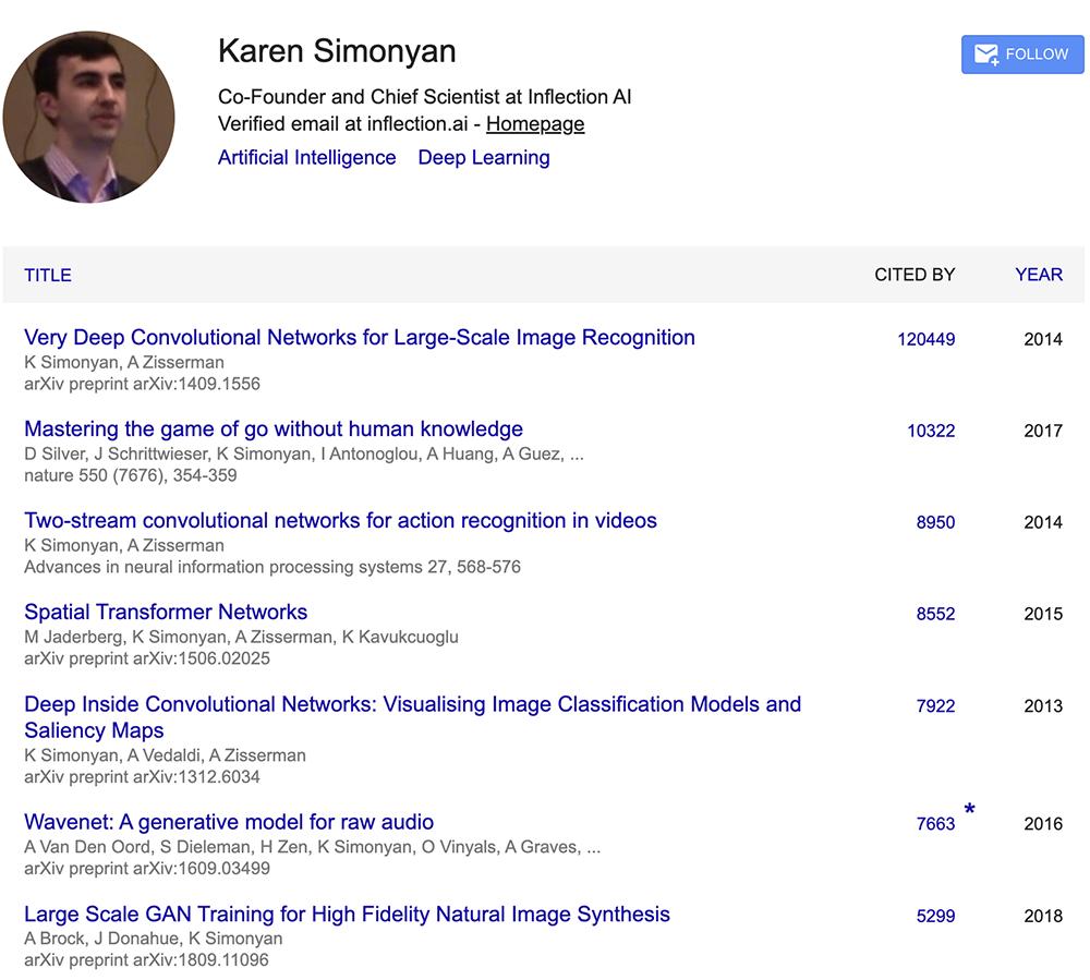 第三位联合创始人是前DeepMind首席科学家Karén Simonyan,现任Inflection AI首席科学家。他是同代中成就突出的深度学习研究者之一,其出版物(包括5篇在学术顶级期刊Nature和Science上的论文)吸引了超过18万次引用。