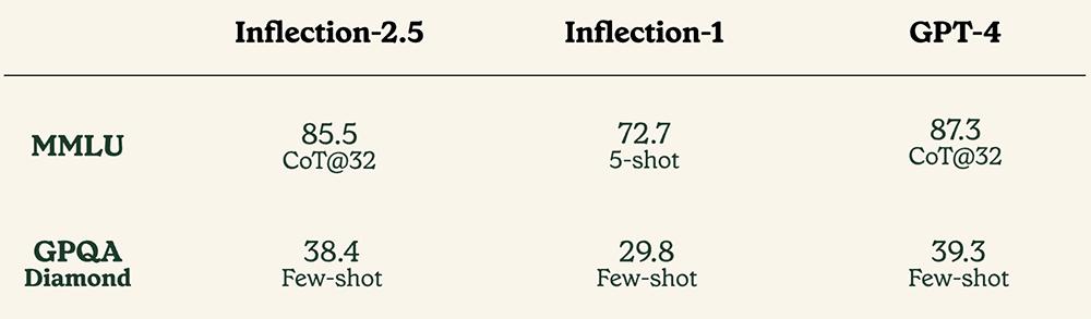 MMLU基准测试衡量了从高中到专业难度的各种任务的性能。Inflection AI还根据GPQA钻石基准进行评估,这是一个极难的专家级基准。