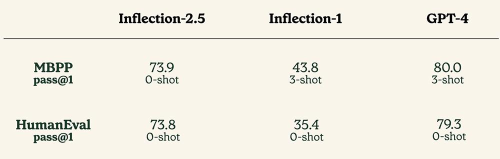 与Inflection-1相比,Inflection-2.5在数学和编程性能方面有了显著进步。下表是在MBPP+和HumanEval+两个编程基准上的评测结果对比。