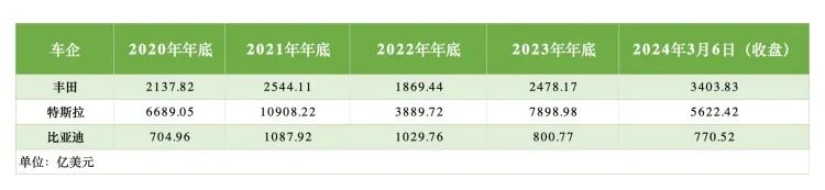 近几年丰田、特斯拉、比亚迪市值变化 制表:品驾