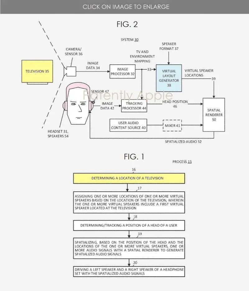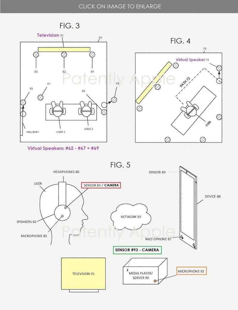 另外,专利当中还对「显示器」做了特别说明,虚拟声场中的观影屏幕,不仅仅局限于传统的电视,而是拥有屏幕或投影的设备都可以实现此类功能,例如笔记本电脑、平板电脑、投影仪、台式电脑屏幕等(需要搭配带有摄像头的 Apple TV 盒子使用)。