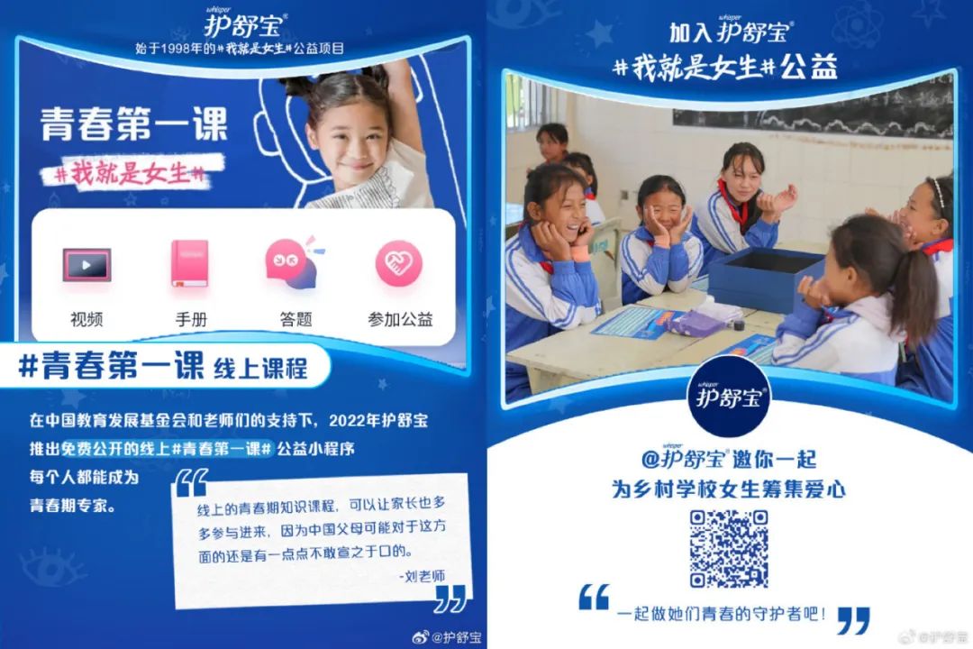 比如护舒宝坚持了 26 年的#青春第一课#教育公益项目,回应用户“女生帮助女生”的诉求,今年首次将#舒适校厕改造计划#上线腾讯公益平台,和更多的人一起为乡村学校的孩子们创造更舒适的环境。