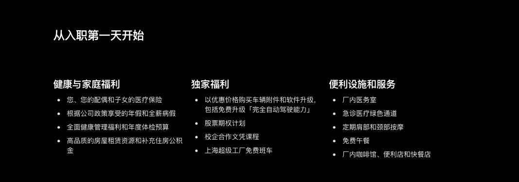 公开信息显示,每位入职的员工,特斯拉都会为其缴纳六险一金,提供免费工作餐、班车,全家免费商业保险等,每个员工还可以获得特斯拉股票,当然也可以选择现金。