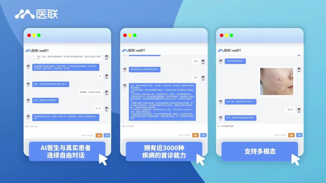 医联AI医生(MedGPT)具有强大的智能诊断能力,可对近3000种疾病进行首诊判断,诊断结果与三甲医院医生的诊断一致性高达96%,能够提供初步的病情分析和诊疗建议。