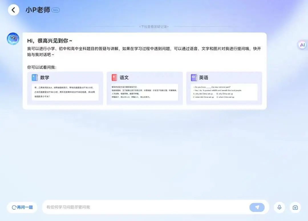 功能方面,小P老师能够为不同年龄段的学生提供从幼儿教育到高中教育阶段全学科的教学支持,包括但不限于语文、数学、英语、科学等课程的答疑解惑和知识点讲解。