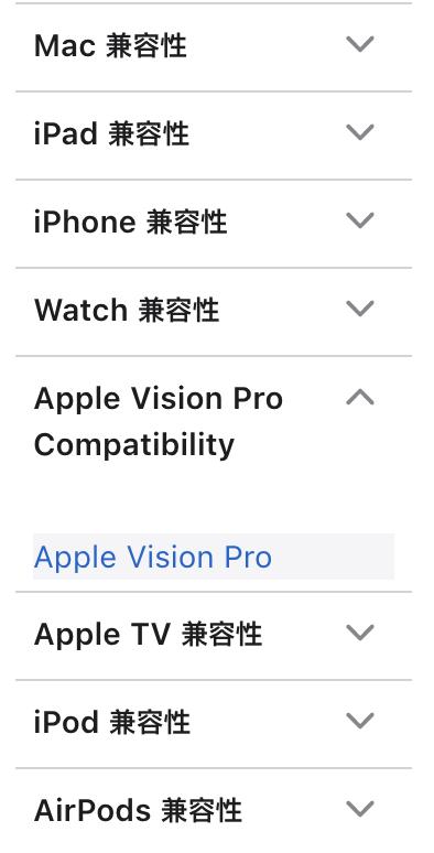 不仅如此,“Apple Vision Pro Compatibility”也与Mac兼容性、iPad兼容性、iPhone兼容性等选项并列,被放进了不同硬件产品的兼容性分类列表中。