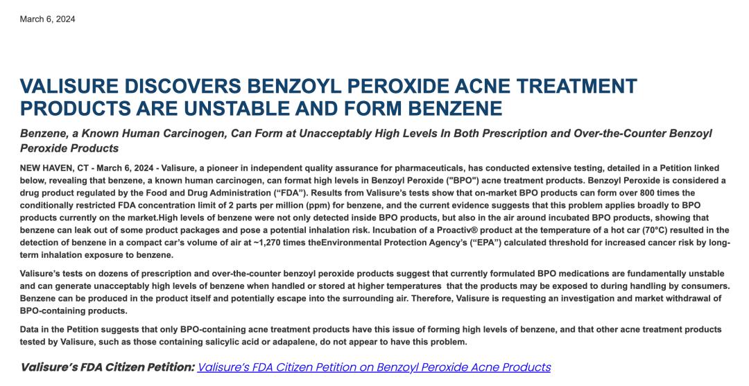由于痤疮是美国最常见的皮肤病,每年影响多达 5000 万人,数以百万计的消费者在不知情的情况下使用了这种产品,大大增加了他们接触致癌物质的概率。美国众议员Rosa DeLauro在一份声明中表示:“对BPO药物出现的情况表示担忧,并再次强调了授权 FDA 在意识到处方药或非处方药的危险后立即采取行动的必要性。DeLauro 曾试图推动立法,赋予 FDA 召回药品的权力,而不是在自愿的基础上与企业协商召回。
