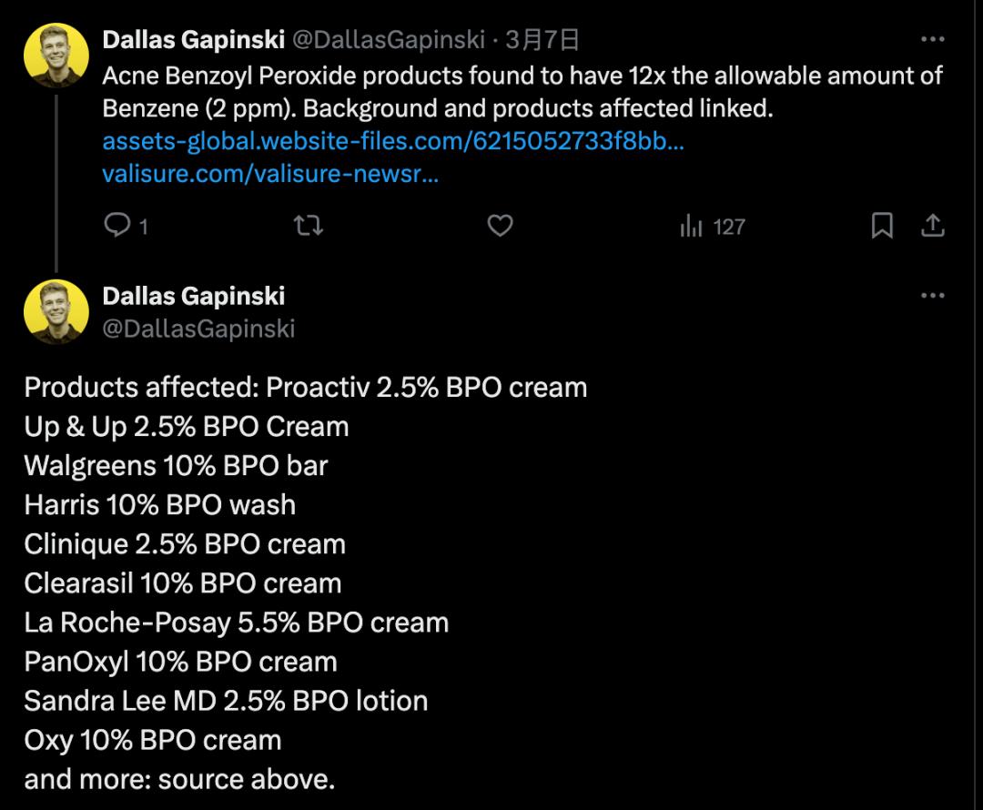 3月7日,美国BPO系列祛痘产品爆出大事件,多家知名品牌的产品中含有远超美国FDA规定的致癌物苯,其含量严重超标。据相关检测实验室数据,该机构认为这些产品有被消费者吸入致癌的风险。