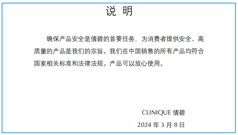 倩碧中国今天(3月8日)也紧急发布说明,称其“在中国销售的所有产品均符合国家相关标准和法律法规,产品可以放心使用”。