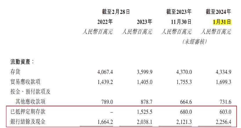 截至2024年1月31日,企业的银行结余及现金为22.56亿元、已抵押的定期存款6.03亿元。也就是说,企业的银行结余及现金甚至覆盖不了短期借款。