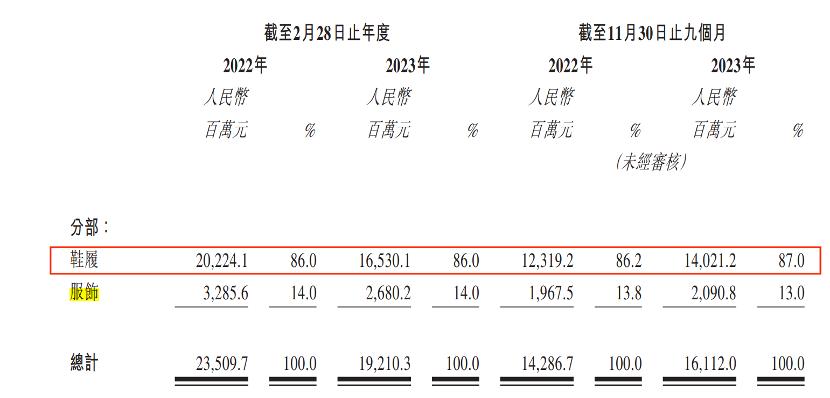 没变的是,鞋履仍然是百丽时尚的绝对支柱。招股书显示,2021财年-2023财年前三季度,鞋履品类贡献的收入比例保持在86%以上。