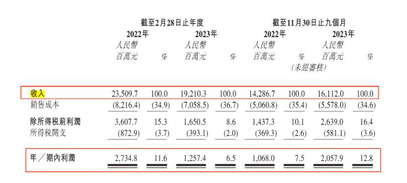 招股书显示,2021财年-2023财年前三季度,百丽时尚的收入分别为235.10亿元、192.10亿元、161.12亿元;净利润分别为27.35亿元、12.57亿元、20.58亿元。