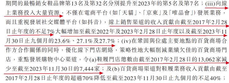 改变的是,在品牌上,百丽时尚将经营范围扩大至BELLE、TATA、73Hours、Champion等19个品牌;在门店上,大幅削减了业绩欠佳的百货商场门店,截至2023年11月30日,鞋履门店数量还剩7444家,较2016财年底下滑43%。(编者按:本文将2016年3月1日至2017年2月28日的财报年度称为2016财年,其他财年依次类推。)