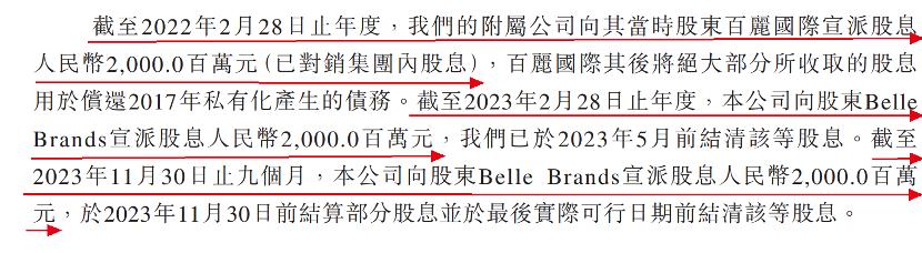 而这与企业多年来的巨额分红举措不无关系。2019财年-2023年前三季度,百丽时尚分别派息70亿元、42.28亿元、20亿元、20亿元及20亿元。