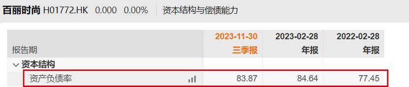 居高不下的借款催高了资产负债率。Wind数据显示,2021财年至2023财年前三季度,百丽时尚的资产负债率分别为77.45%、84.64%、83.87%,直追以高负债率著称的房企。
